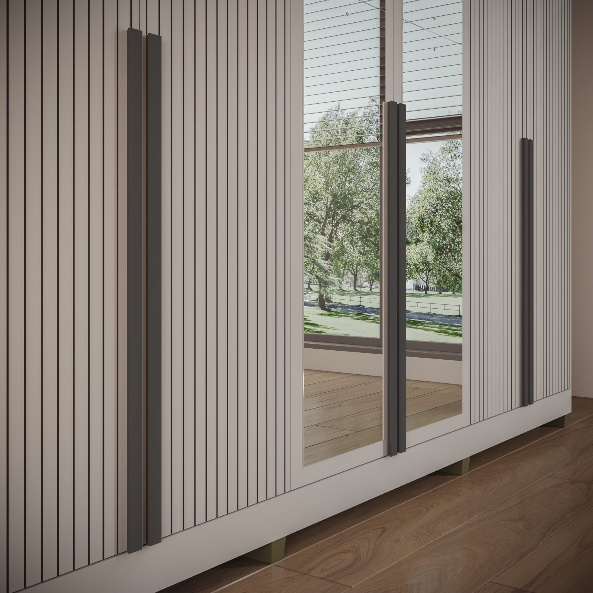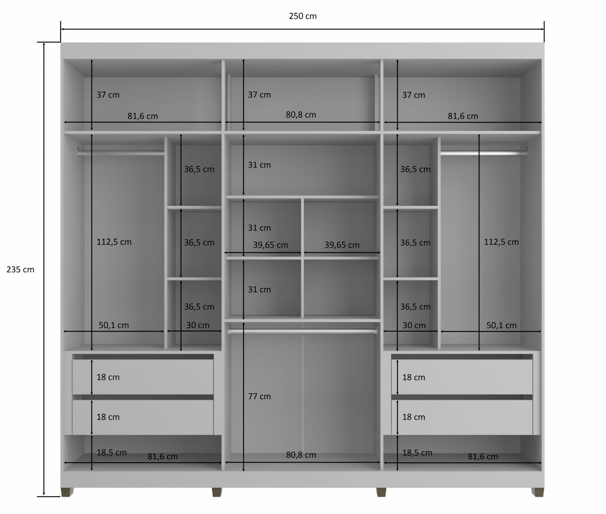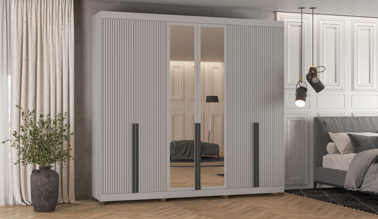 O Guarda-Roupa acompanha espelho, puxador, pés, 4 gavetas, corrediças telescópica e possui escala de brilho com textura: brilho e fosco.